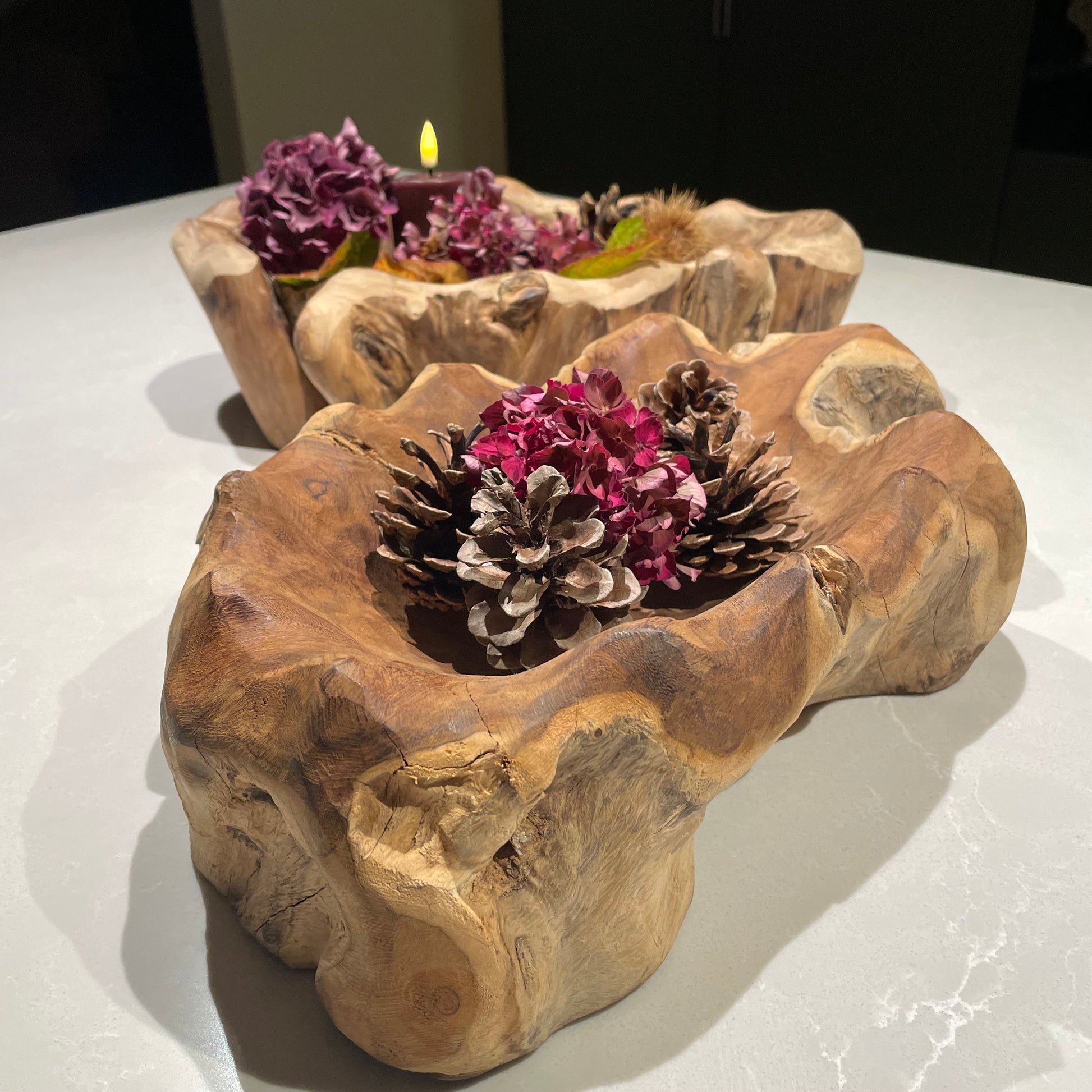 Håndskåret skål lavet af rødderne af teaktræet. Dette er et håndlavet produkt, størrelser og former kan variere. Hver skål bærer sit eget DNA.