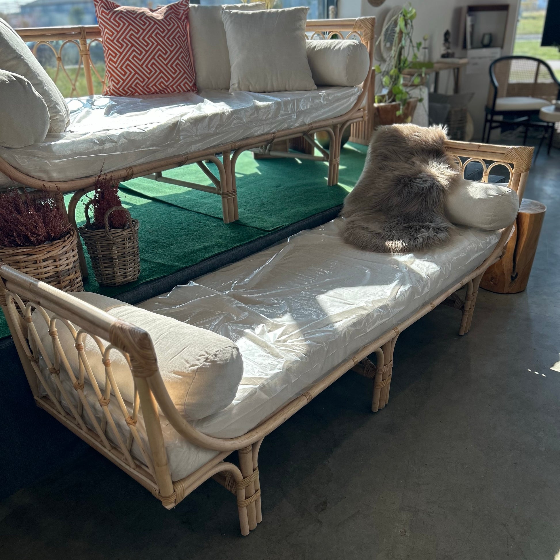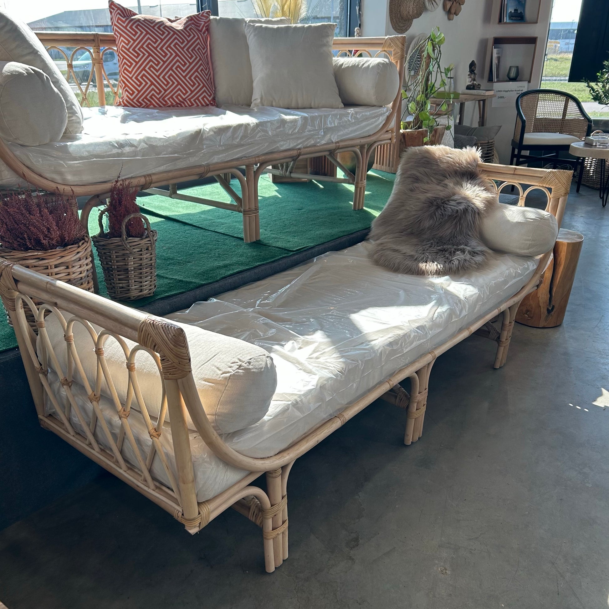 Upptäck tidlös elegans med denna rottingsofa / daybed – en stilfull och funktionell möbel som förenar naturlig charm med modern design. Utan ryggstöd längs långsidan får dagbädden ett öppet och luftigt uttryck som passar perfekt i både inomhus- och utomhuslounger. Dagbädden levereras komplett med en bekväm madrass och två runda kuddar, vilket skapar den perfekta platsen för avkoppling, läsning eller sociala stunder.