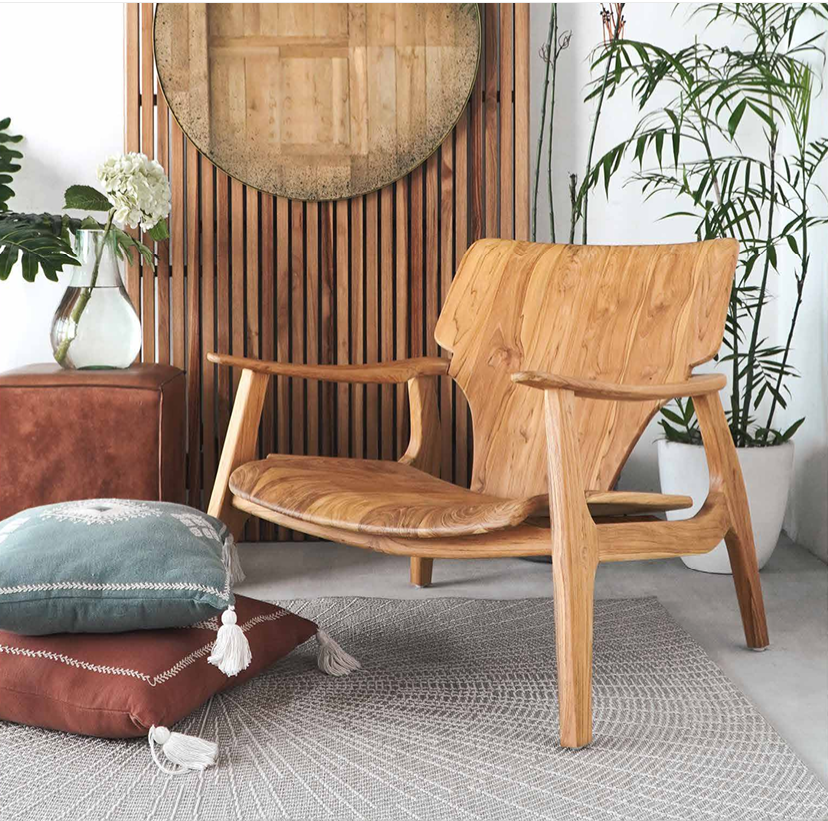 Fåtölj i naturfärgad lackerad teakträ med en vacker, minimalistisk, rustik och unik design. Perfekt inredningsdetalj i hallen eller som fåtölj bredvid soffan i vardagsrummet. Smycka med en mysig pläd och ett litet träbord vid sidan om. En fåtölj som skapar en varm och hemtrevlig känsla.