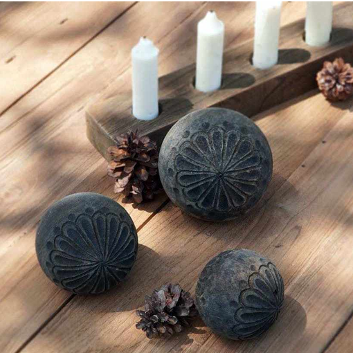 Dessa dekorativa kulor finns i tre storlekar och har fint handsnidade mönster som ger textur och karaktär. Välj mellan naturlig teak för ett organiskt, varmt uttryck eller gråtvättad teak för en mer rustik, modern look.