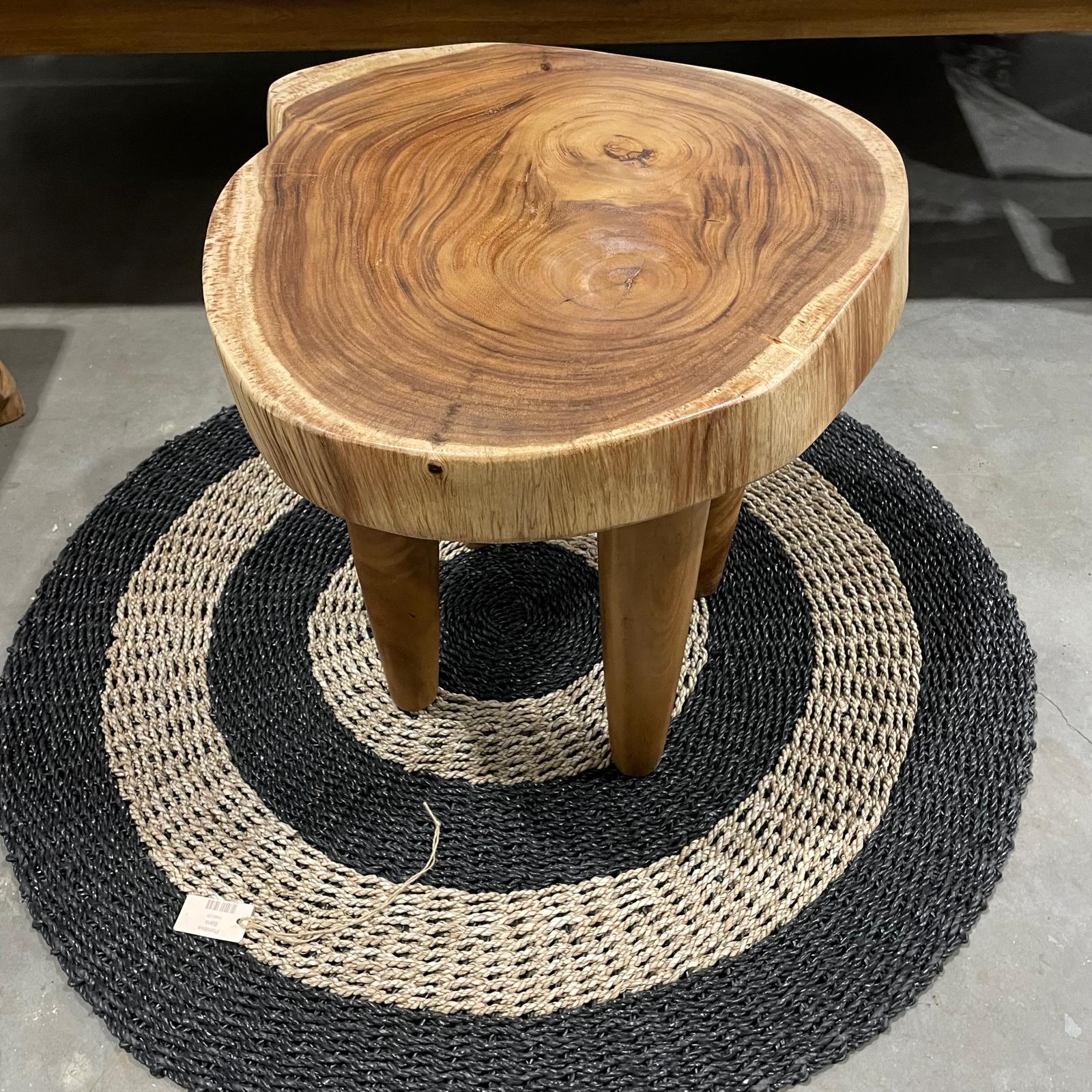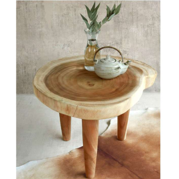 Förhöj vardagsrummet eller den inglasade balkongen med ett rustik runt soffbord i 7 centimer vackert suarträ skiva och ben. Bordet lämpar sig ej för utomhusbruk.
