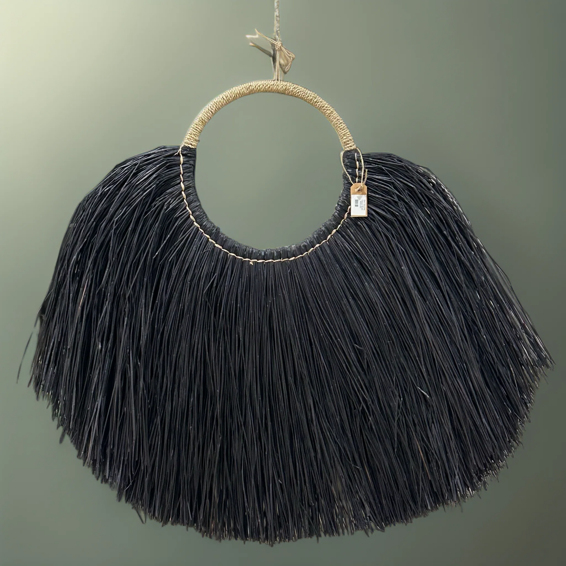 Denna distinkta väggdekoration är gjord av vackert svart vattenhyacintfibrer och för in en känsla av reslust i ditt hem. Den naturliga strukturen och de mjuka, varma nyanserna väcker associationer till fjärran platser och tillför en subtil, fängslande charm till inredningen.