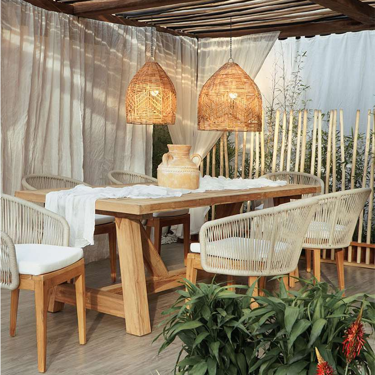 Lucia matstol med vit snabbtorkande dyna. Ram av tewak med beige repfinish på sidorna och baksidan.