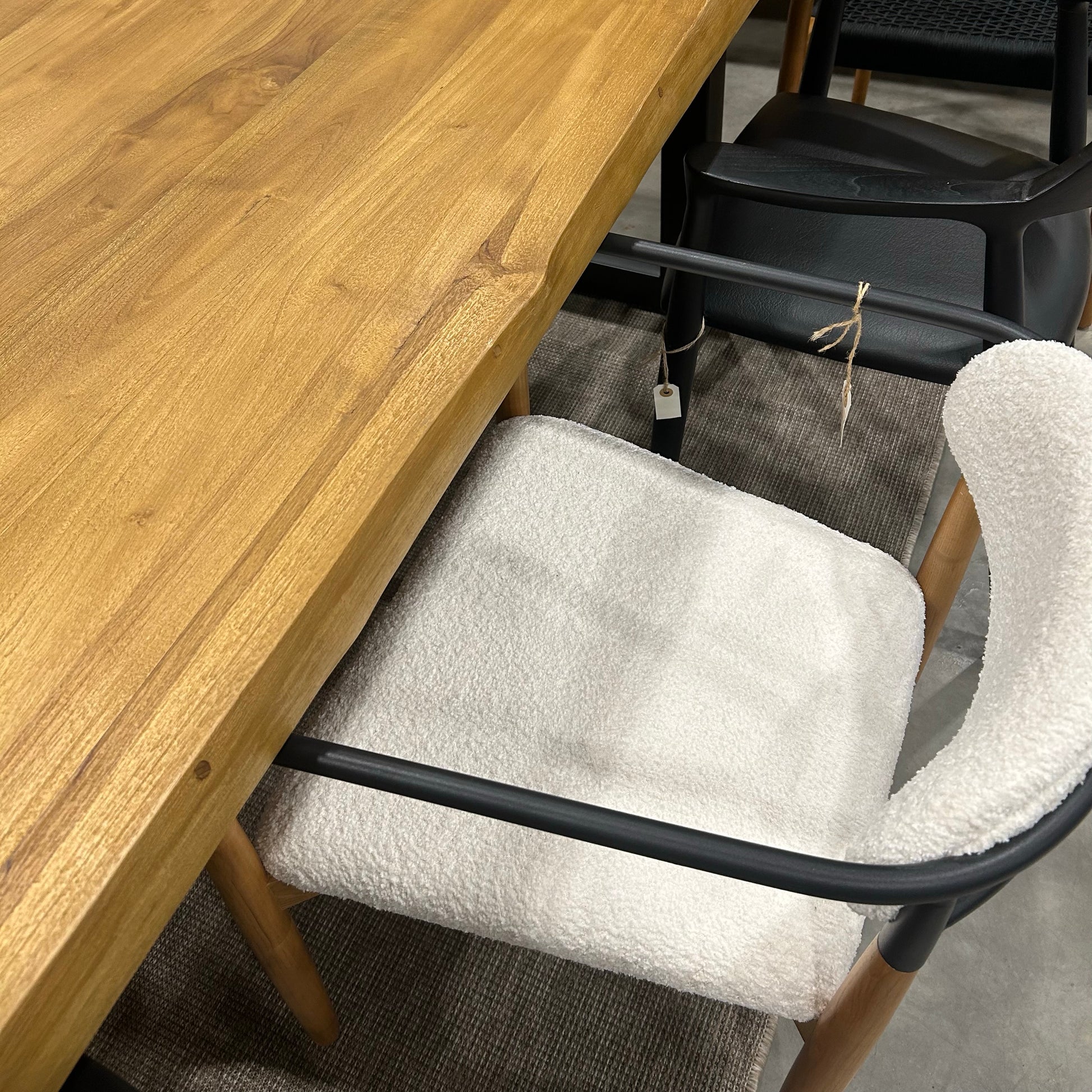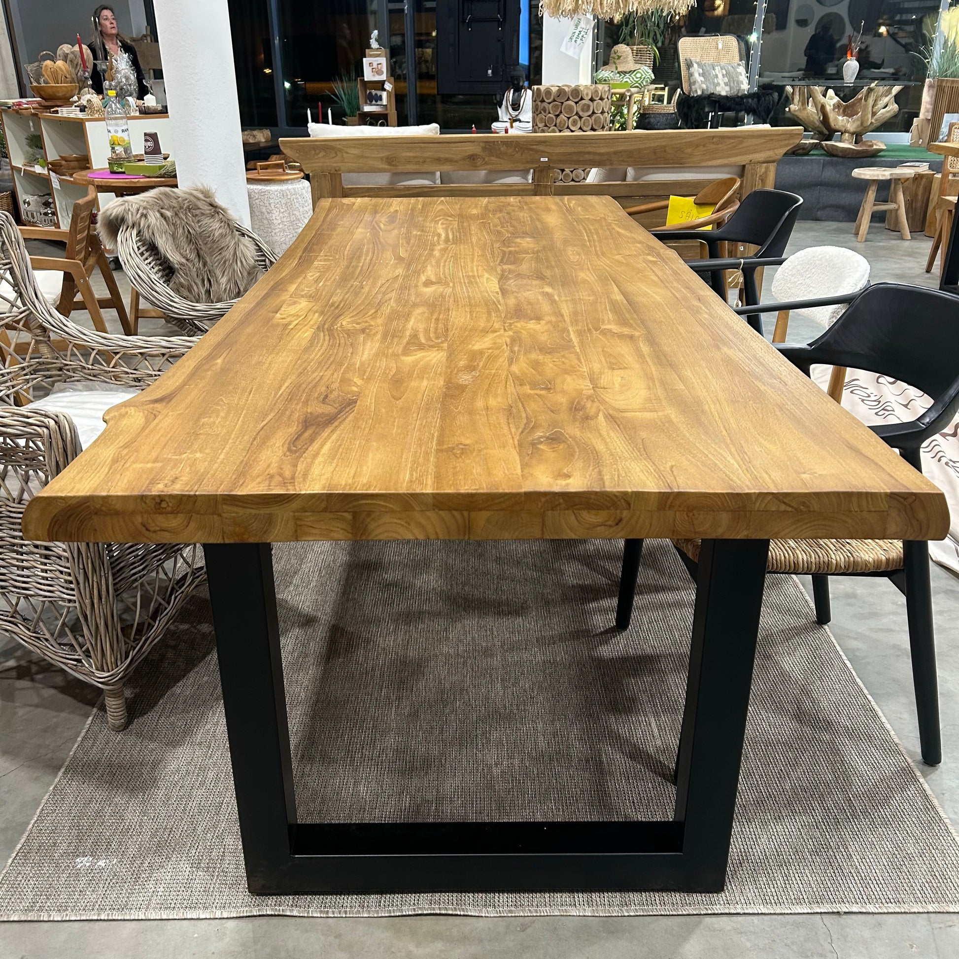 Låt vårt vackra bord Batur i teak och vågig kant bjuda in till hemmets framtida middagsbjudningar. Bordet har mattsvarta bordsben i stål som ger en iögonfallande detalj. Detta innebär att bordskanten på de två långsidorna är naturlig och vågig, precis som träet ser ut i sin naturliga form. Det ger bordet en autentisk känsla, som om det kommer direkt från naturen.
