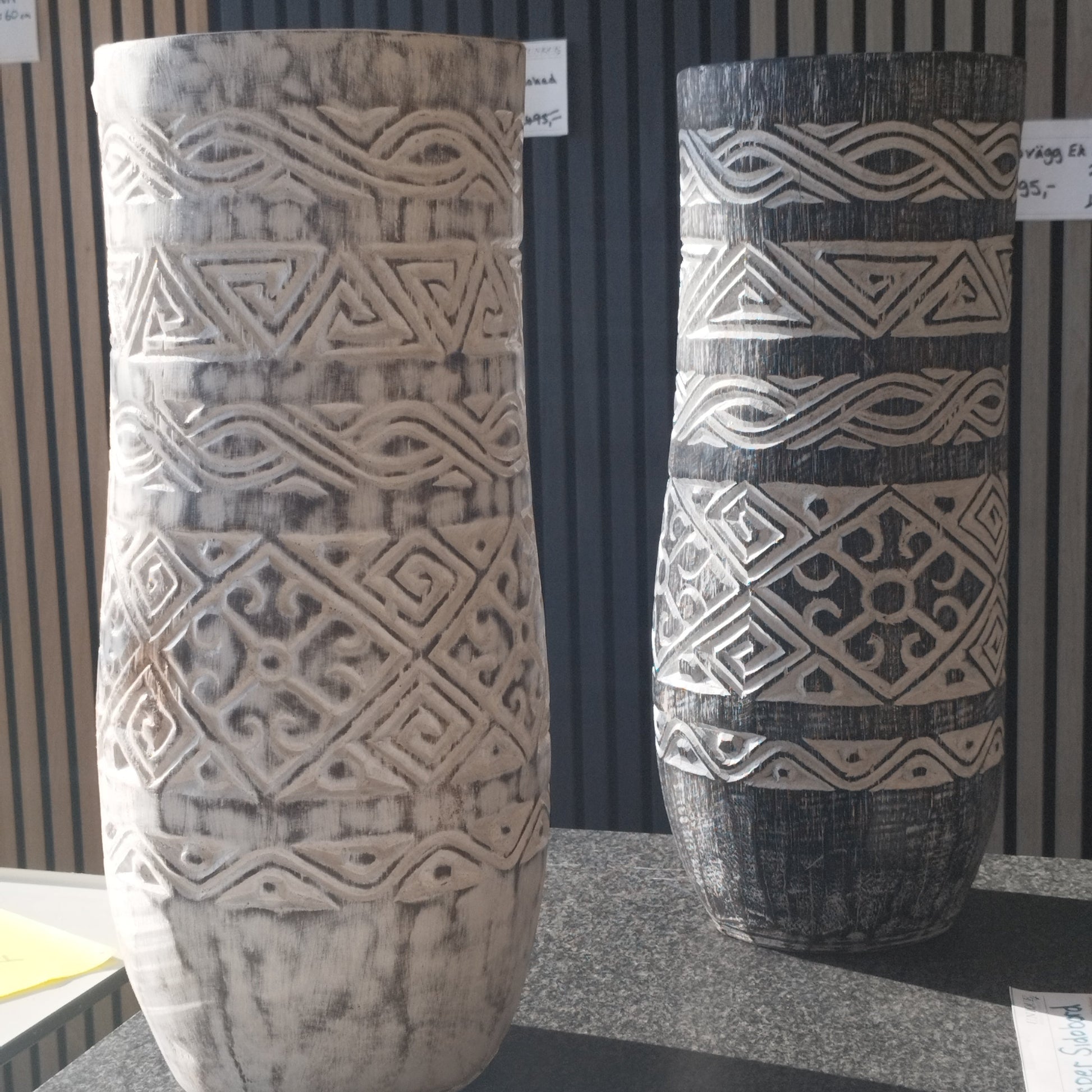 Upptäck våra stora vaser snidade av palmstammar. Välj mellan natur med vit mönster eller brun med vit mönster. Dessa stora krukor är ett idealiskt dekorativt föremål för din terrass, under en uteplats, och kommer även att gå inomhus i en entré, hall eller vardagsrum