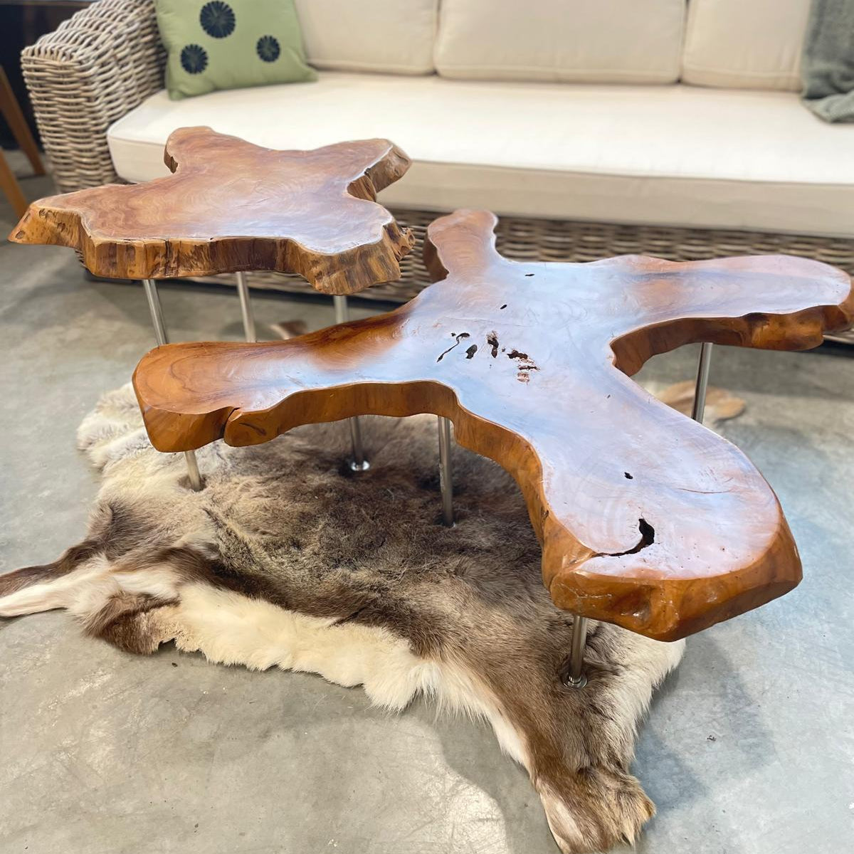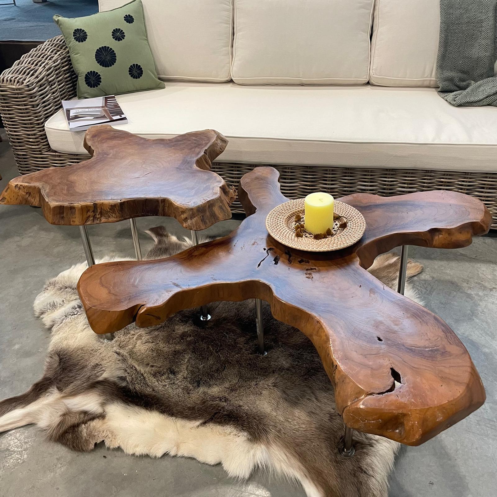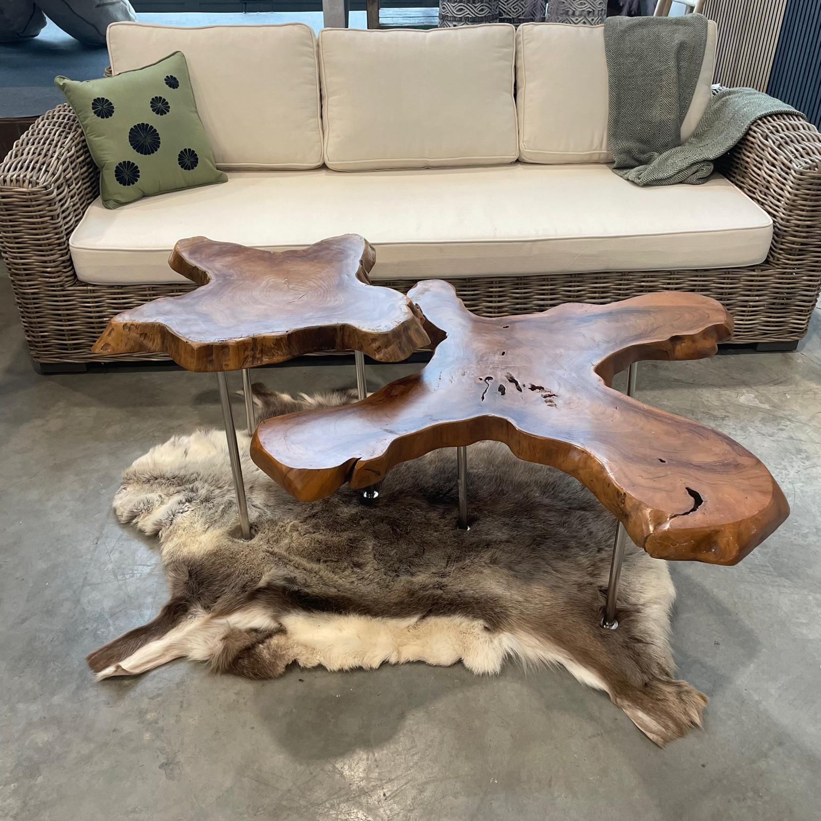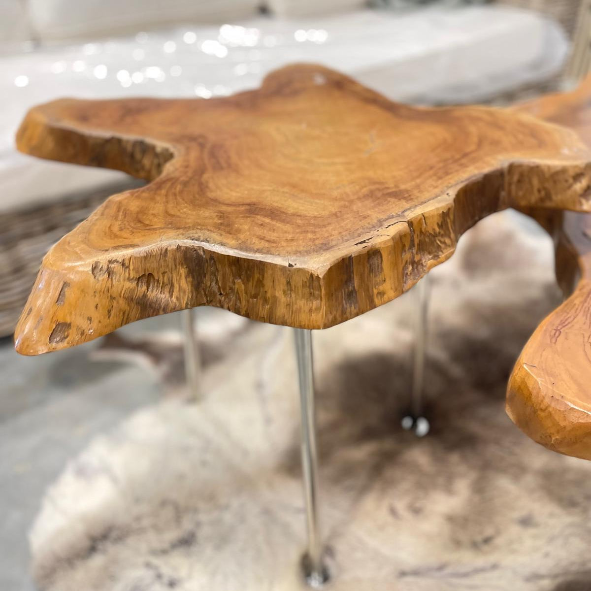Ett distinkt soff- och sidobord tillverkat av en enda skiva lackerat teakträ, kombinerat med modern design i rostfritt stål. Inget bord är det andra likt – varje detalj bär spår av naturens variationer som ger möbeln karaktär och personlighet. Ett stilrent statement-piece som förenar rå natur med tidlös design.