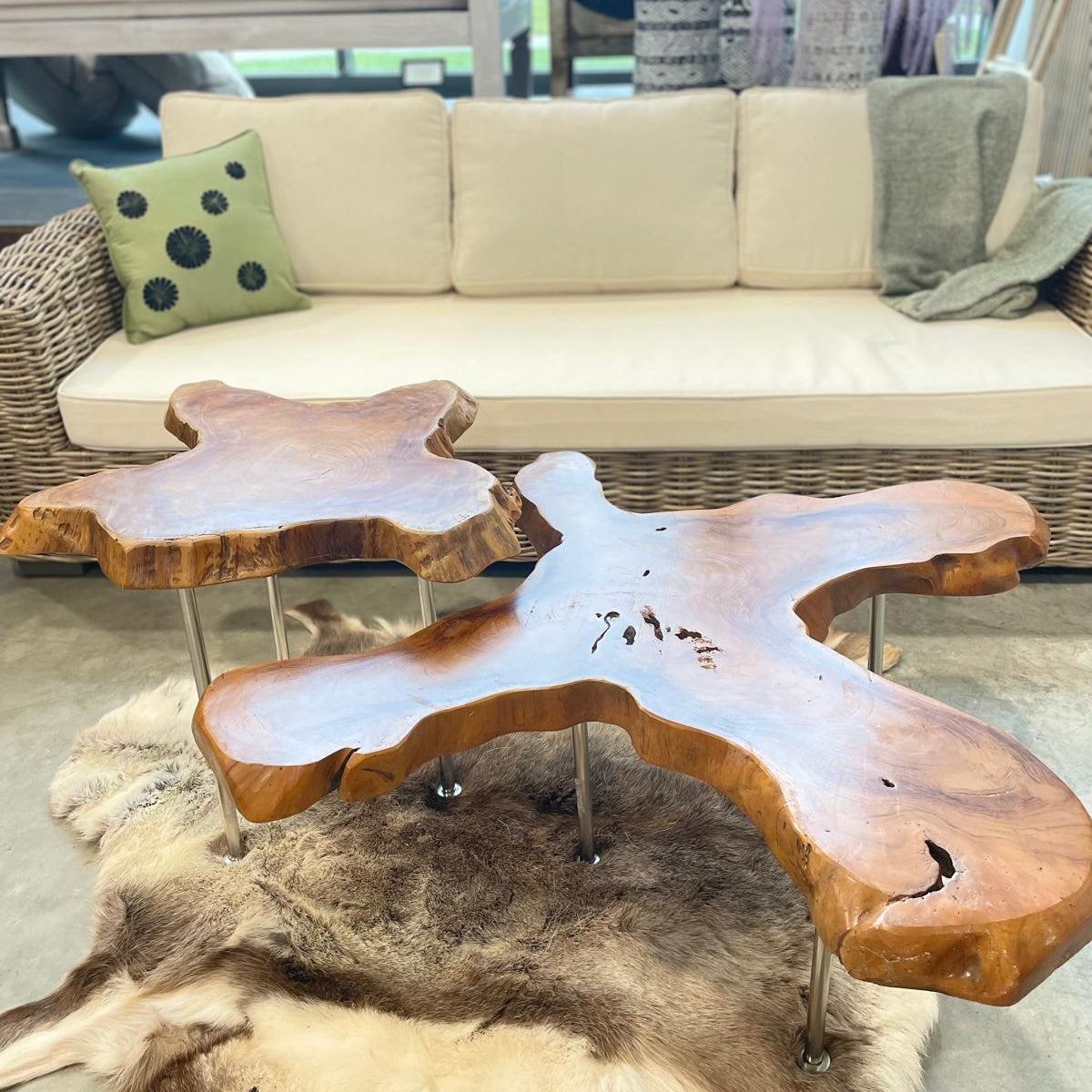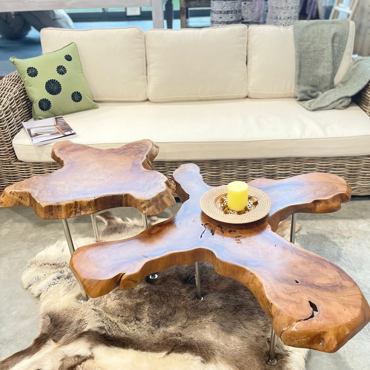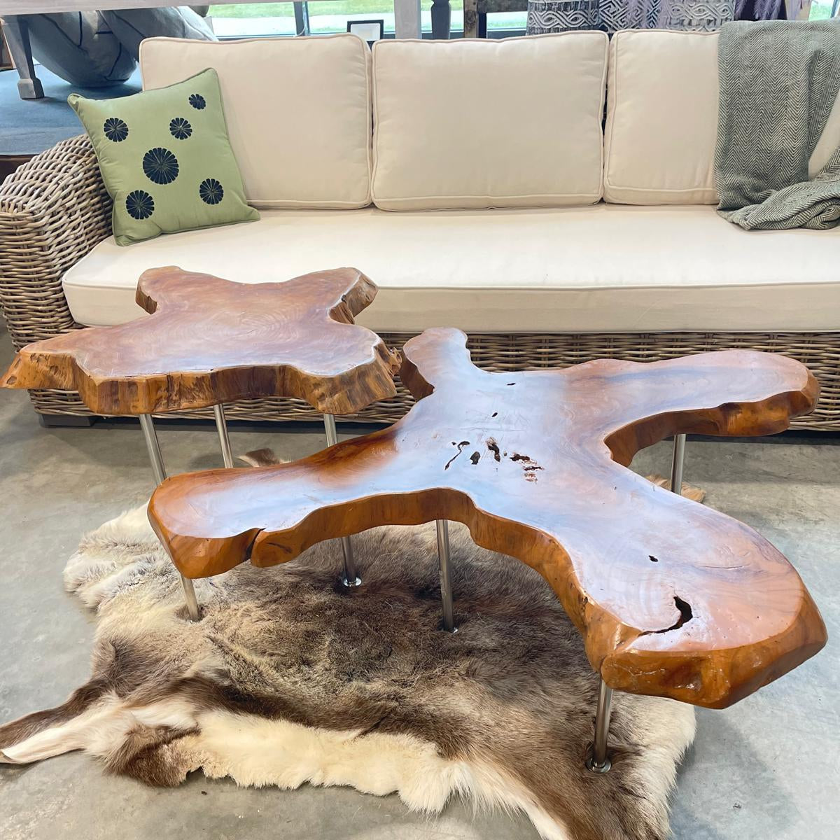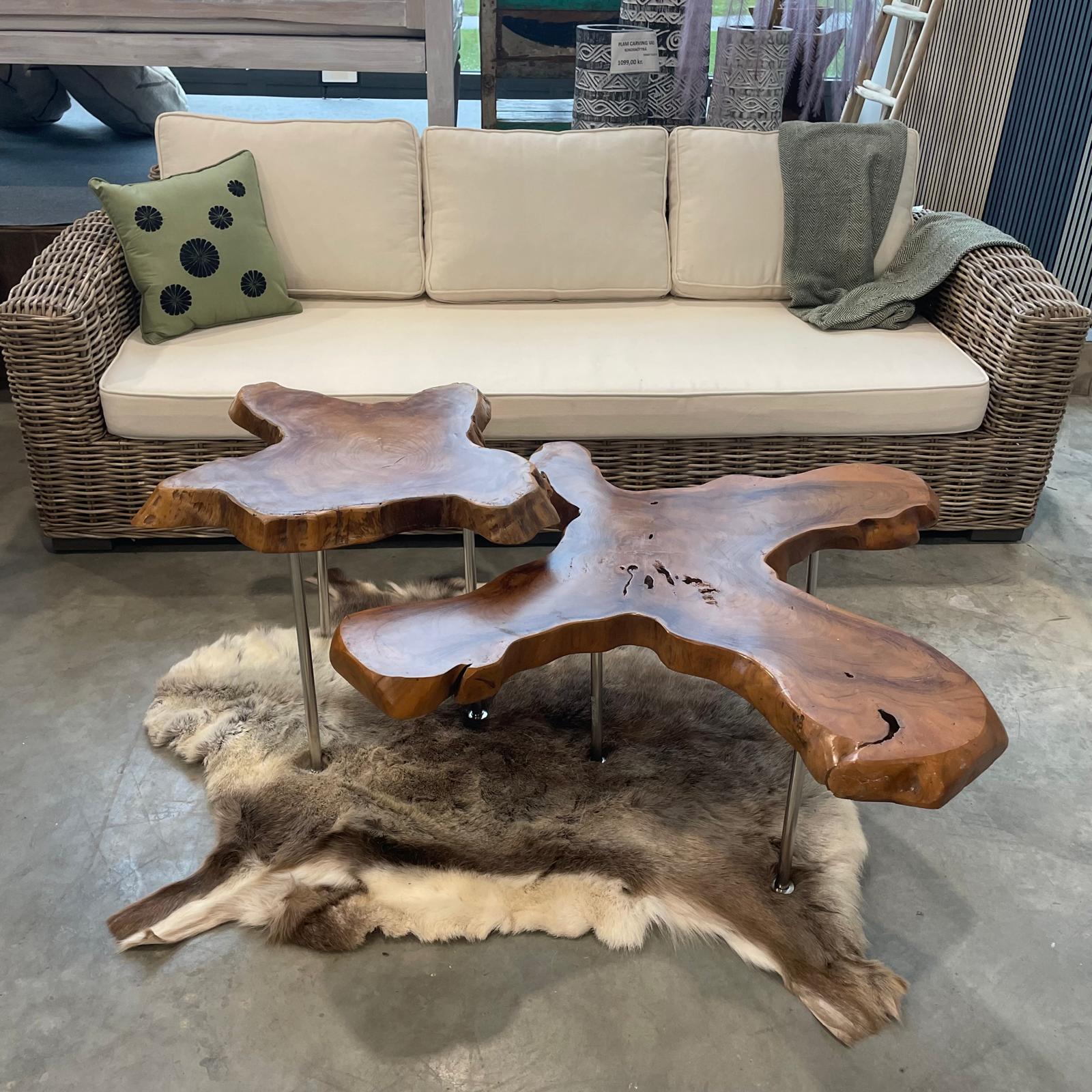 Ett distinkt soff- och sidobord tillverkat av en enda skiva lackerat teakträ, kombinerat med modern design i rostfritt stål. Inget bord är det andra likt – varje detalj bär spår av naturens variationer som ger möbeln karaktär och personlighet. Ett stilrent statement-piece som förenar rå natur med tidlös design.