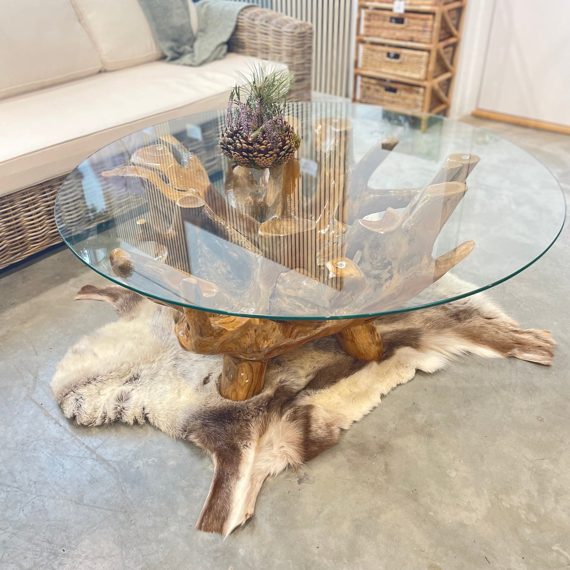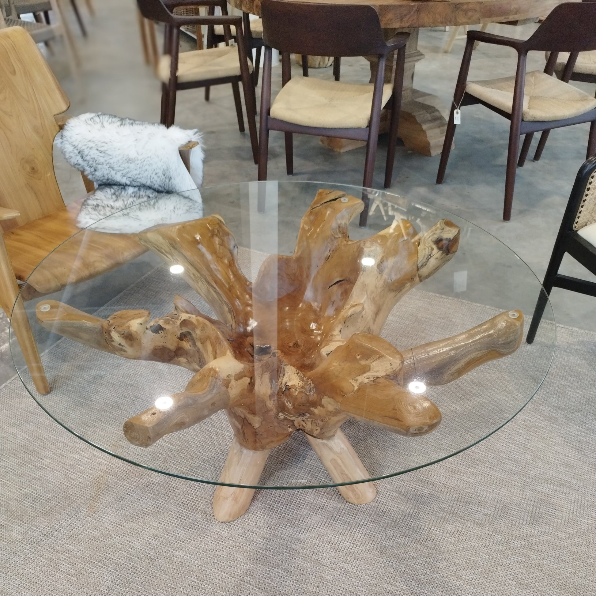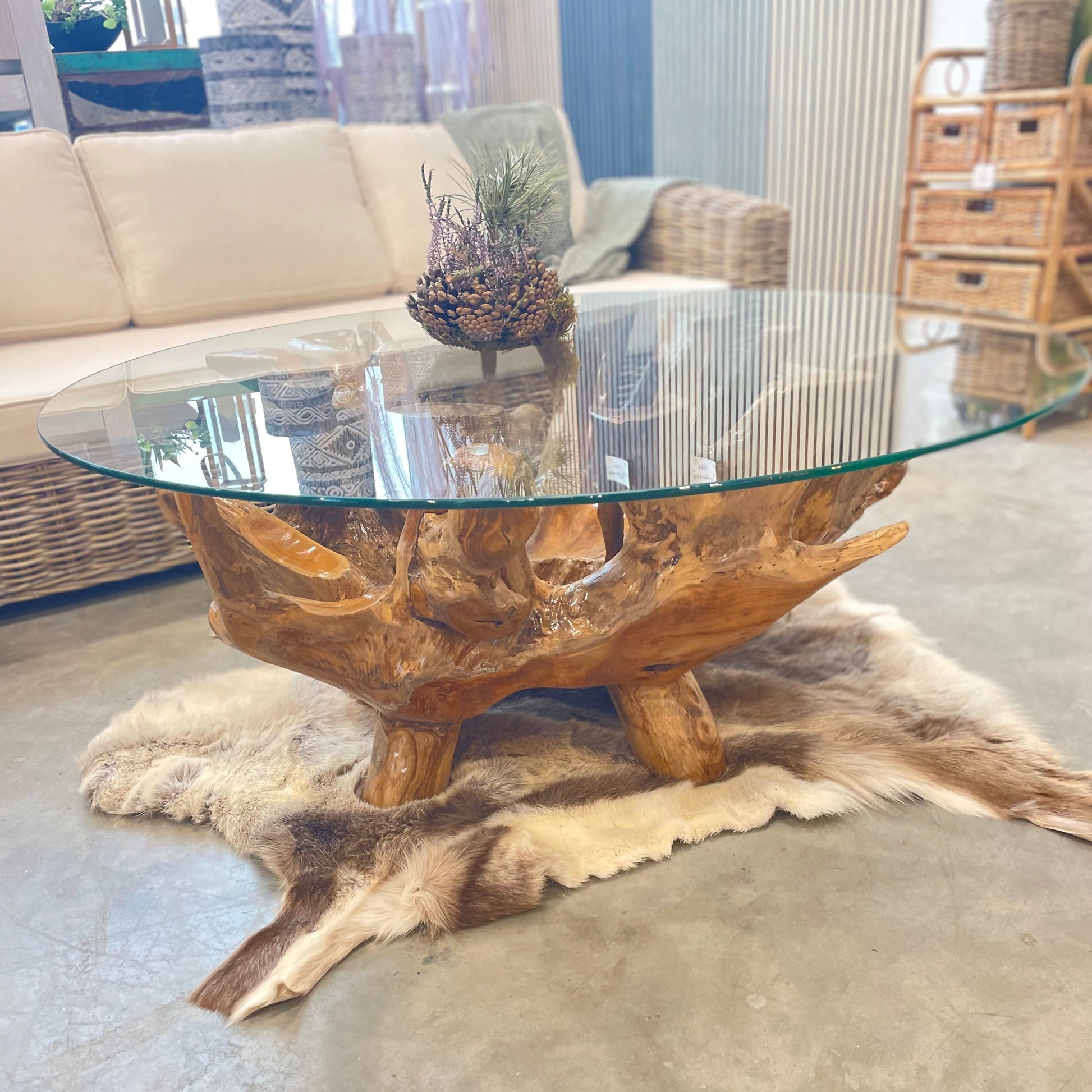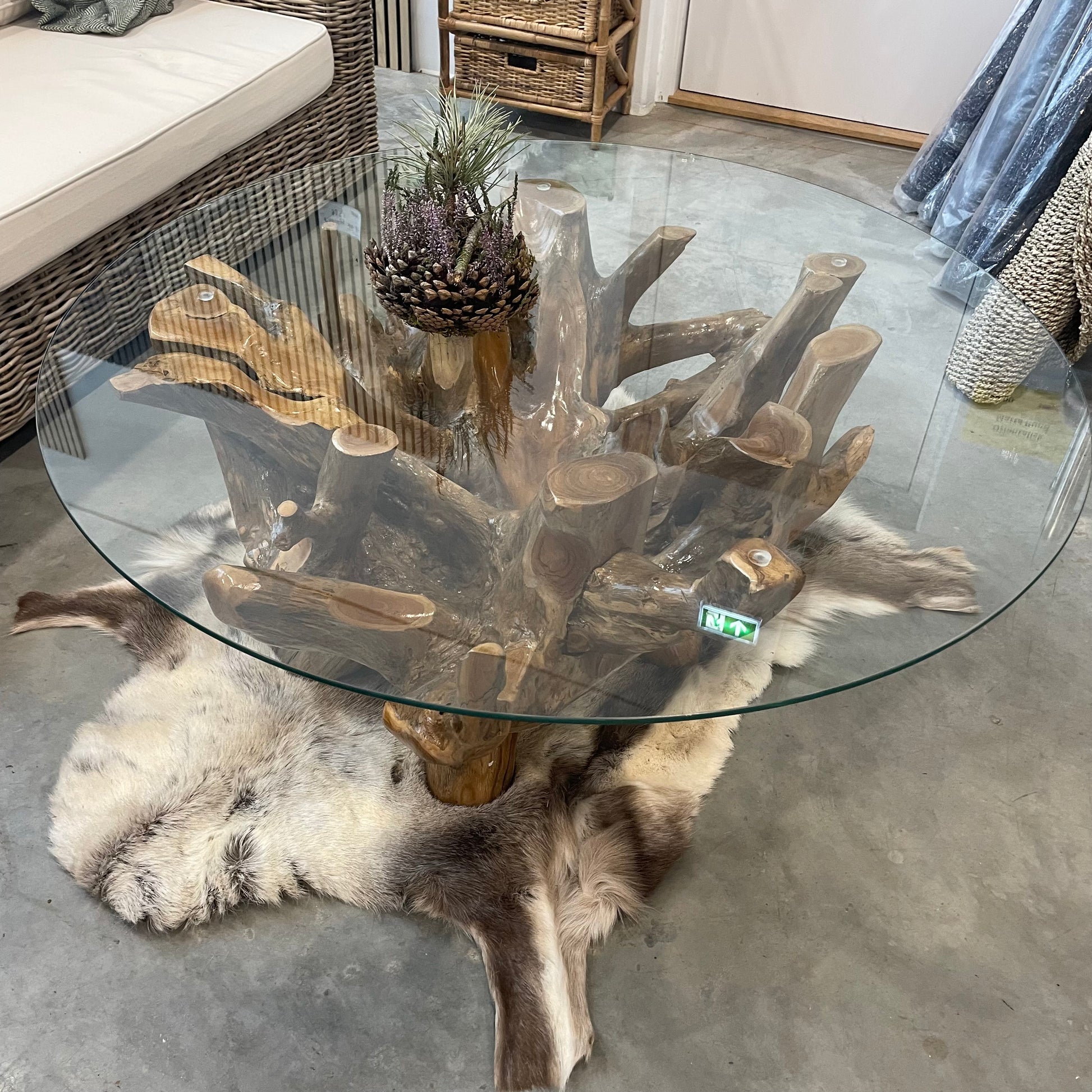 Ett fantastiskt och helt unikt soffbord tillverkat av naturlig teakrot med tempered glasskiva. Varje bord berättar sin egen historia genom trädets naturliga former och mönster. Den rustika och naturliga designen gör bordet till en blickfångare i rummet – perfekt för dig som vill ta in en bit av naturen i ditt hem. Inga två bord är någonsin likadana.